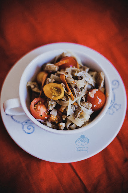 Zainteresował mnie konkurs na przyślij przepis - trzeba było ugotować potrawę do trzech głównych składników dodając maksymalnie jeden (też główny),a ziół i przypraw można było używać do woli. Postanowiłam wziąć w nim udział i cos wymyślić. Wybór składników z dwóch dostępnych zestawów był łatwy - wzięłam makaron, pomidory i mięso wieprzowe. Długo zastanawiałam się co oryginalnego wymyślić. W końcu padło na polędwiczkę i makaron ryżowy, którego nigdy wcześniej nie używałam. Głowiłam się co wymyślić i na dwie godziny przed przygotowaniem wzięłam marchewkę jako dodatkowy składnik. I to było to! Makaron okropnie mi smakował, lubemu też (chociaż nie wiem czy też okropnie ;P). Ten przepis na pewno jeszcze wykorzystam, bo robi się szybciutko, a jest pyszne :D